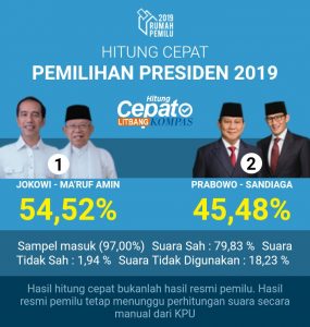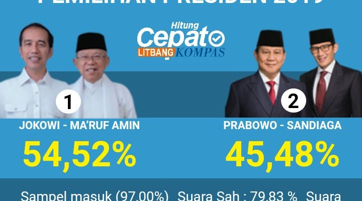 SINARBANTEN.COM, Jakarta – Pasangan calon presiden dan calon wakil presiden Joko Widodo-Maruf Amin unggul atas pasangan Prabowo Subianto-Sandiaga Uno berdasarkan hasil hitung cepat atau quick count sejumlah lembaga atas Pilpres 2019 pada Rabu (17/4/2019).