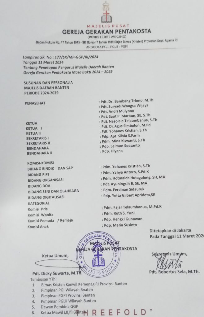 Berikut susunan dan personalia Majelis Daerah Banten periode 2024-2029 sesuai SK. Nomor: 177/SK/MP-GGP/I/2024.