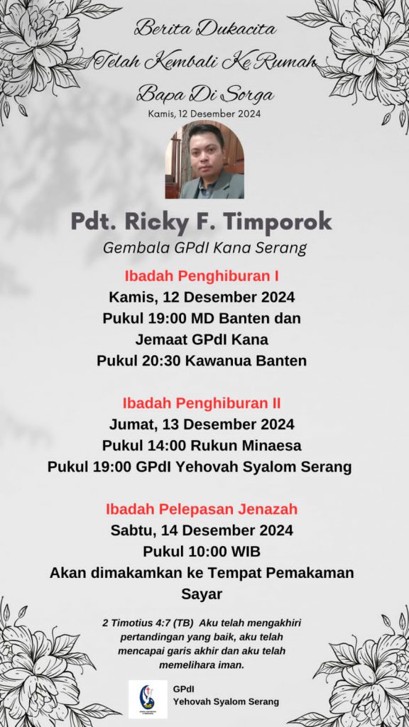 SINARBANTEN.COM, Serang – Segenap pimpinan dan karyawan media online dan cetak SINAR BANTEN mengucapkan, “Turut berduka cita yang sedalam-dalamnya atas berpulangnya Pdt. Ricky Timporok, S.Th ke rumah Bapa di Surga”.